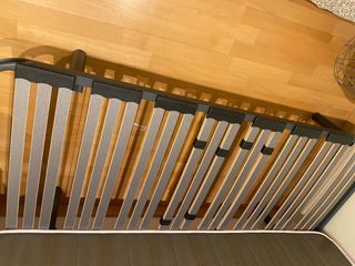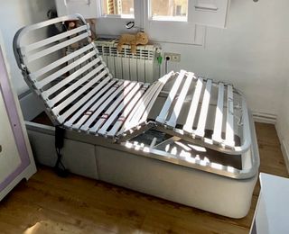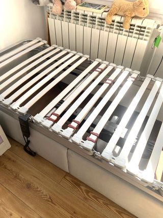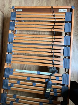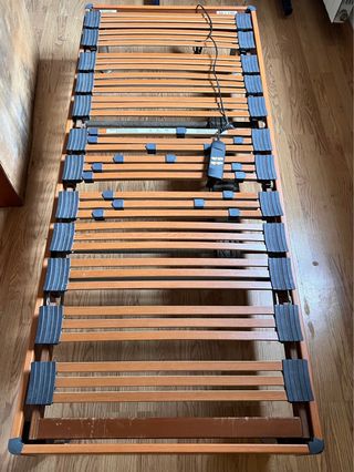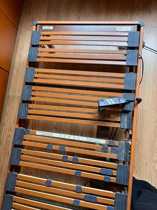 Base de cama articulada con somier de láminas de madera y estructura de metal. - Láminas de madera flexibles. - Soportes de plástico para las láminas. - Mecanismo de articulación integrado.