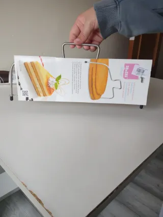 Herramienta para cortar tartas de forma precisa. Permite ajustar la altura para un corte perfecto. - Fabricado en acero inoxidable y plástico. - Diseño plateado y blanco.
