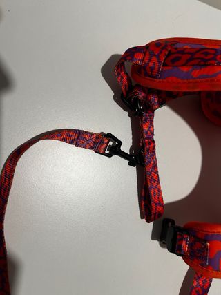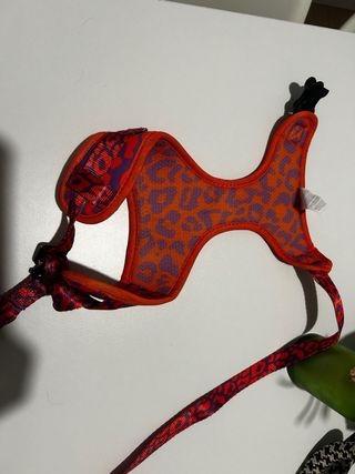 Conjunto de arnés y correa para perros de tamaño mediano. - Arnés con estampado de leopardo en naranja y morado. - Correa a juego con el mismo estampado. - Hebilla de sujeción en el arnés.
