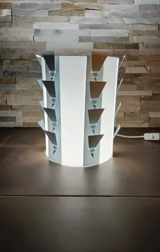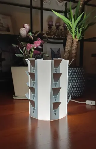 Lámpara de diseño artesanal, una pieza única que aporta un toque moderno a cualquier espacio. Su estructura combina metal y plástico para un acabado elegante. - Diseño cilíndrico con detalles triangulares. - Iluminación ambiental suave. - Interruptor de encendido/apagado en el cable.