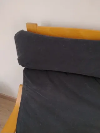 Butaca modelo Poäng de Ikea con estructura de madera y cojines de tela. - Marco de madera curvada. - Cojín de asiento y respaldo acolchados. - Diseño moderno y ergonómico.