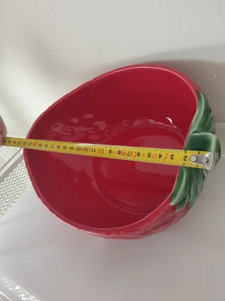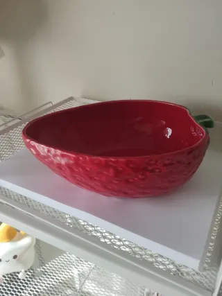 Bol decorativo con forma de fresa. - Color rojo vibrante. - Textura exterior que imita la piel de la fruta. - Tallo verde en la parte superior.