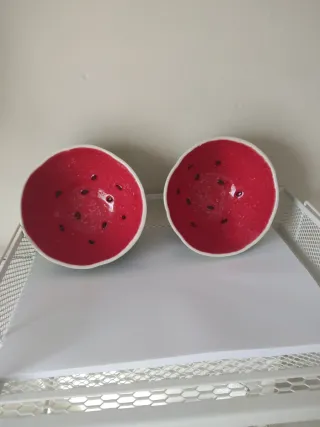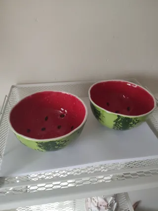 Set de dos cuencos con diseño de sandía. - Diseño interior rojo con pepitas negras. - Exterior verde con detalles. - Fabricados en cerámica.