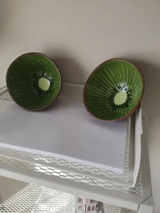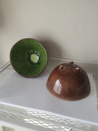 Conjunto de dos cuencos de cerámica con un diseño inspirado en un kiwi. Uno de ellos es marrón por fuera y el otro es verde por dentro, imitando la fruta. - Piezas únicas con un acabado brillante. - El cuenco verde tiene un diseño detallado de las semillas y el interior del kiwi.