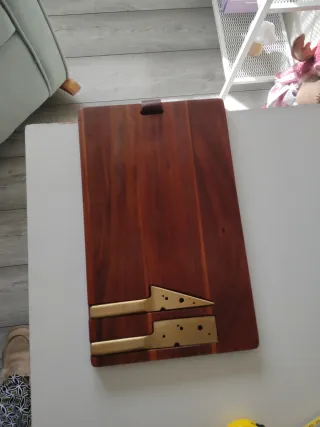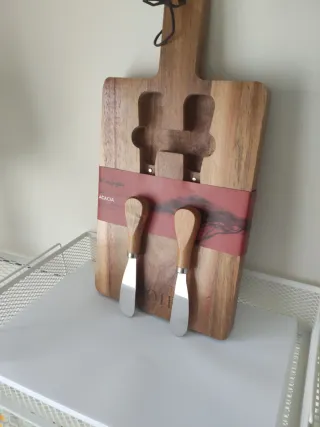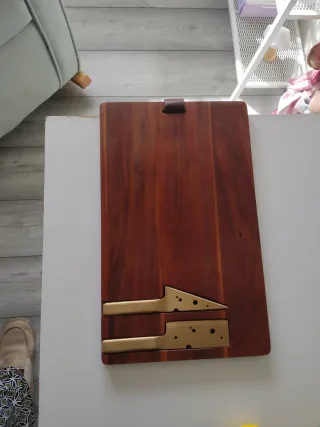 Tabla de quesos de la marca Corte Inglés, con un diseño elegante y funcional. - Fabricada en madera de alta calidad. - Detalles en metal dorado. - Incluye dos utensilios para quesos.