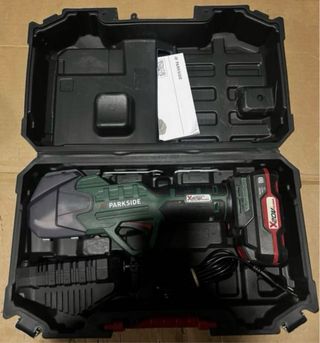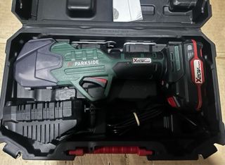 Tiera de podar eléctrica Parkside, ideal para trabajos en el jardín. Se presenta en su maletín original. - Incluye tijera de podar. - Batería X20V TEAM. - Cargador. - Maletín de transporte. incluye bateria de 2 ah y cargador de 2,4 ah 20v