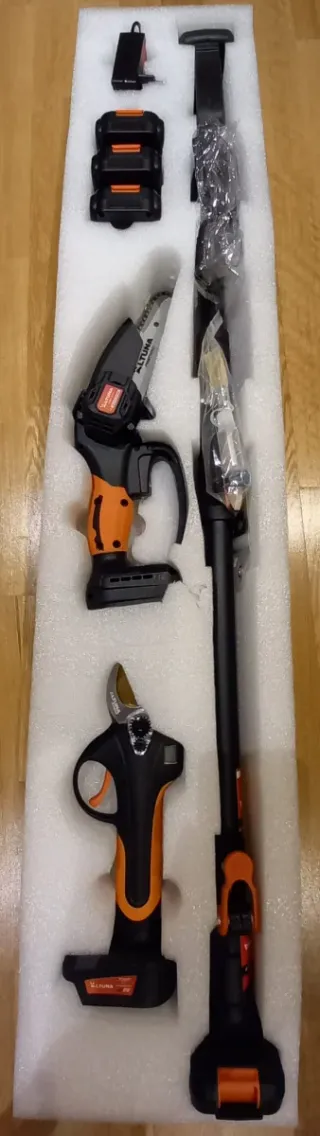 Set de herramientas eléctricas para jardinería, sin abrir. - Incluye mini motosierra, tijeras de podar electricas y pértiga telescópica. - Dos baterías de 21V 4000mAh. - Cargador de batería, cadena de repuesto, gafas, guantes y distintas herramientas de mantenimiento