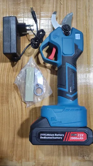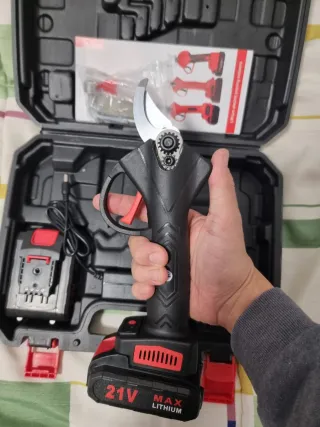 Tijera de podar eléctrica con baterías recargables. - Incluye dos baterías de 21V. - Viene con cargador y cable. - Incluye guantes de protección. - Manual de usuario. - Llaves Allen para ajuste.