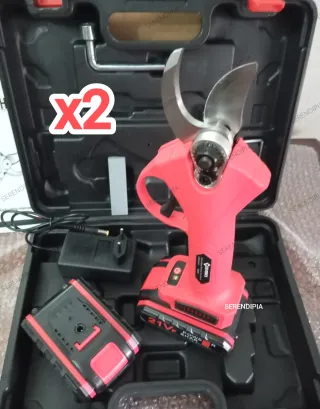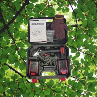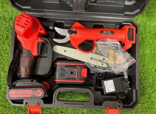 Set de tijeras de podar eléctricas con todo lo necesario para empezar a trabajar. Incluye un maletín para guardarlas y transportarlas fácilmente. - Tijeras de podar eléctricas. - Dos baterías de 36V. - Cargador de baterías. - Llaves de ajuste. - Cuchilla de repuesto. - Guantes de protección. - Gorra roja.