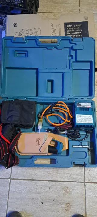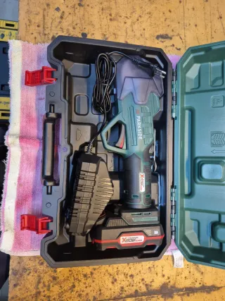Tijera de podar a batería, ideal para trabajos en el jardín. Se encuentra en muy buen estado, con poco uso. - Incluye cargador y cables. - Viene en su maletín original para un fácil transporte y almacenamiento.