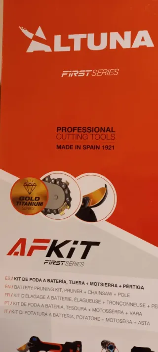 Kit de poda a batería ALTUNA AFKIT con tijera AF28, motosierra AF150 y pértiga extensible AFPER. Ideal para iniciarse en la poda eléctrica en jardines y frutales. Gama FIRST de ALTUNA.