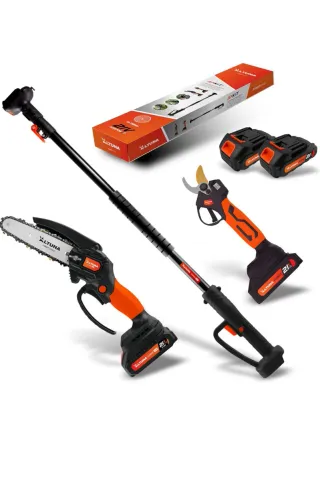 Kit de herramientas Altuna - Motosierra a batería cadena de titanio - Tijera de podar a batería cuchilla de titanio - Pértiga telescópica - 2 baterías de 21V - Gafas de protección - Cargador - Accesorios de mantenimiento - Dos cadenas de titanio OPCIÓN: BATERÍA ADICIONAL POR 10€ MÁS