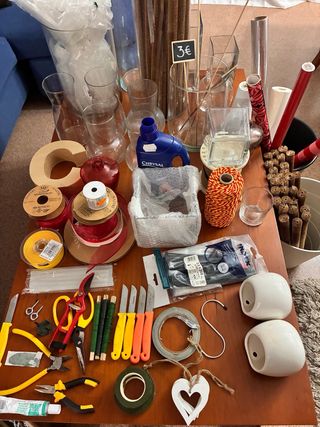 Lote de materiales variados para floristería. - Jarrones de cristal de diferentes tamaños. - Tijeras de podar y otras herramientas. - Cintas decorativas y alambre. - Macetas blancas. - Otros accesorios para hacer arreglos florales. SE VENDE TODO