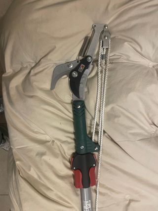 Tijeras de podar con pértiga para alcanzar ramas en altura. - Mecanismo de cuerda para accionamiento. - Cuchilla de corte. - Mango ergonómico.