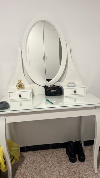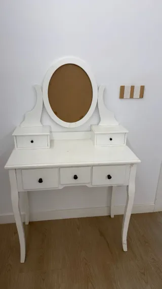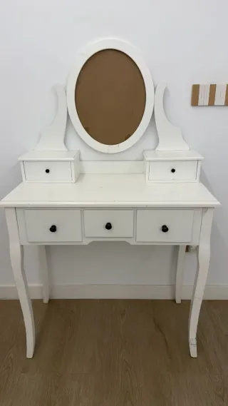 Tocador súper precioso , vendido porque no me pega con la decoración que quiero hacer en la habitación pero esta nuevo , no viene con los accesorios y costo montarlo 5 horas, no me desplazó , ni rebajó precio , es un chollo 250 euros con el banco es de color cuero blanco y funda incluida