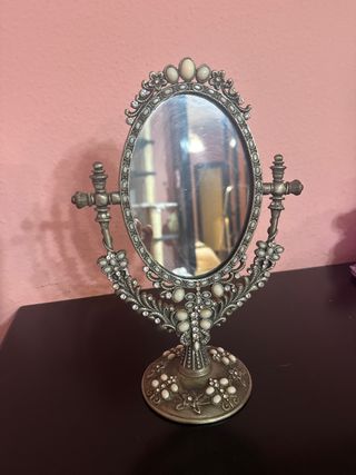 Elegante espejo de tocador con un diseño clásico y ornamentado. Su base le da estabilidad y permite girarlo fácilmente. - Marco con detalles intrincados. - Base decorativa. - Diseño ovalado.
