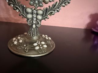 Elegante espejo de tocador con un diseño antiguo y ornamentado. Ideal para añadir un toque de distinción a cualquier tocador o mesa. - Marco detallado con motivos florales y gemas. - Base estable y decorativa. - Acabado metálico con aspecto envejecido.