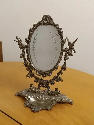 Elegante espejo de mesa antiguo, de bronce, con un diseño intrincado estilo imperial. Años 50. Espejo de tocador antiguo, con un diseño ornamentado que presenta detalles florales y figuras de pájaros en su estructura y base. El espejo es ovalado y basculante, lo que permite ajustar su ángulo. *No se garantiza que sea bronce*