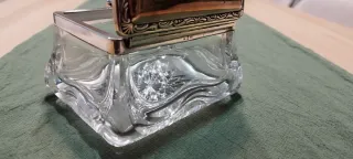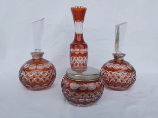 Precioso juego de tocador antiguo, 4 piezas. Cristal de Bohemia tallado y detalles bañados en plata.