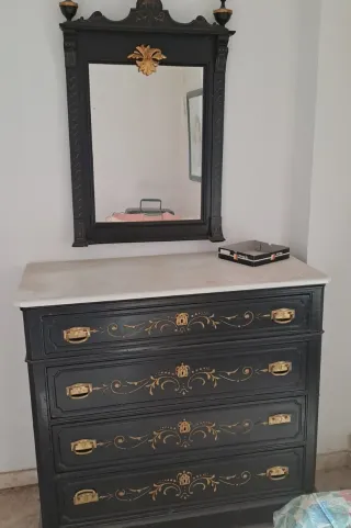 Conjunto de mueble tocador y espejo de estilo antiguo. El mueble cuenta con una superficie de mármol y detalles dorados.por pieza o lote todo el lote. 250€ - Diseño con cuatro cajones. - Tiradores dorados. - Marco del espejo con ornamentación dorada.