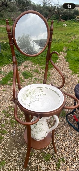 Palanganero de madera con espejo y jarra