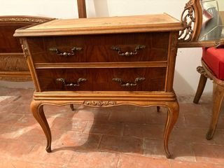 Preciosa habitación antigua de madera para restaurar. Se compone de un tocador con espejo y una mesita de noche a juego. Ambos presentan un estilo clásico con delicados detalles tallados. Ideales para un proyecto de restauración. - Tocador con tres cajones y espejo. - Mesita de noche con dos cajones. - Patas torneadas con estilo Luis XV. - Madera maciza con signos de antigüedad.