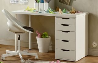 mesa escritorio o tocador de Ikea SYVDE. El cajón grande es ideal para tener en orden el secador de pelo, la plancha y otros objetos que ocupan bastante espacio. El cajón, que es amplio y está forrado de fieltro, ofrece mucho espacio para guardar joyas y productos de maquillaje. Los cajones llevan un sistema integrado para abrir/cerrar suave y silenciosamente. Los cajones, fáciles de abrir y cerrar, llevan topes. Al tener un resistente tablero de vidrio, el mueble es fácil de limpiar y las manchas no penetran en la superficie.