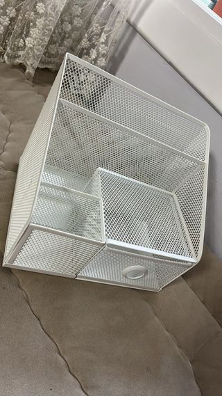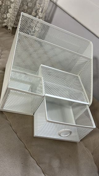 Organizador de escritorio o tocador, ideal para mantener tus cosas ordenadas. Es de metal, color blanco y tiene un diseño elegante y práctico. - Perfecto para baño, tocador o escritorio. - Incluye un cajón y varios compartimentos.