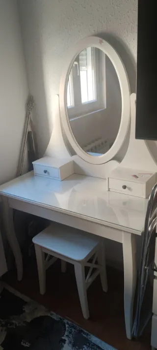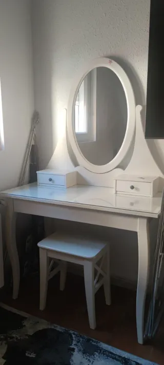 Elegante tocador de Ikea con un diseño moderno y funcional. Perfecto para tu espacio. - Acabado en blanco. - Espejo ovalado. - Incluye cajones para almacenamiento.