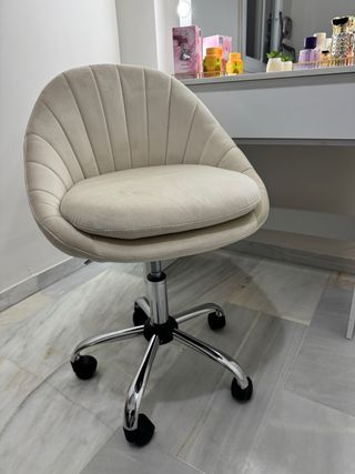 Elegante silla de tocador con un diseño moderno y cómodo. - Asiento acolchado. - Base giratoria con ruedas. - Altura ajustable. Nueva sin usar, guardada y protegida con su plástico.
