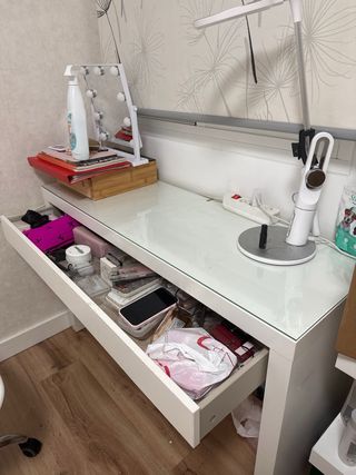 vendo escritorio o vale como cómoda,tocador con 2 cajones,puede valer para muchas cosas tiene cajon guarda cables más 2 cajones más, regalo estantería para arriba y con dos cajones más ver sin compromiso en ikea me costo 169€ más 49 la leja de arriba