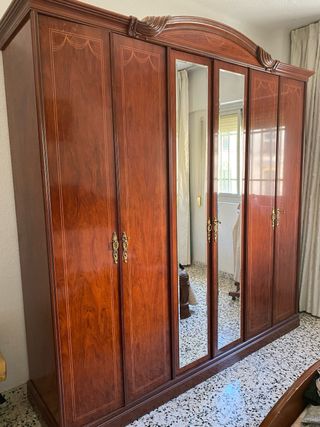 OFERTA. habitacion de matrimonio compuesta por: - Armario de tres grandes cuerpos. La parte central con espejos Medidas: 220cm*210cm*55cm - Dos mesillas de noche - Comoda/tocador con gran espejo y amplios cajones. 105 cm*200*38 - Cabecero y piecero de cama de 1.35 cm. Incluye colchon ✅ Perfecto estado, como nuevo. Se recoge en Jaen capital Transporte y desmontaje a cargo del comprador