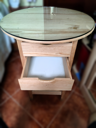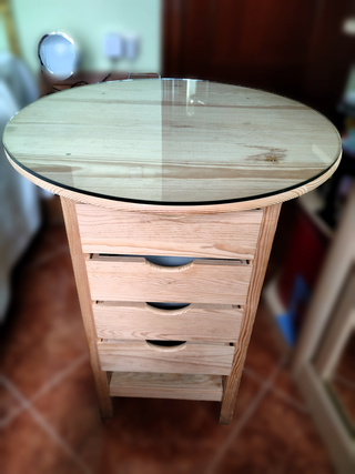 📦 Qué incluye 4 cajones, tapa de cristal redonda sobre base de madera de pino, mueble para mesa auxiliar, recibidor o tocador compacto para dormitorio o salón, espacio de almacenaje. ⚠️ Estado Estado excelente, estructura firme, cajones deslizantes, cristal superior en buen estado. 🚚 Condiciones de venta No hago envíos.
