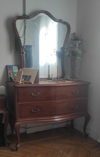 Tocador de estilo clásico isabelino,creo que de cerezo, diseño elegante,en bastante buen estado (Sin polilla),las uniones de los cajones son típo Cola de milano. El espejo tiene alguna picadura en el azogue,lo normal en un mueble de 60 y tantos años y la tapa del mueble se saneó con decapante y aceite de linaza. Con un lijado y cera quedaría perfecto,un mueble de calidad por menos precio que uno de Ikea. Cabe en el ascensor. - Espejo con marco curvo que puede ir sobre el mueble o colgado. - Cajones con tiradores ornamentados.