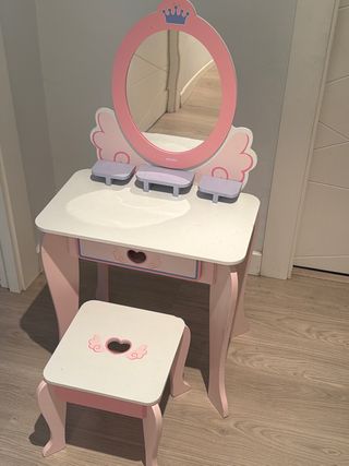 Precioso tocador infantil de madera, perfecto para que los más pequeños jueguen a maquillarse y peinarse. - Diseño con espejo ovalado y detalles de corona. - Incluye un pequeño taburete a juego. - Cajón frontal para guardar accesorios. - Adornos de alas y corazón.