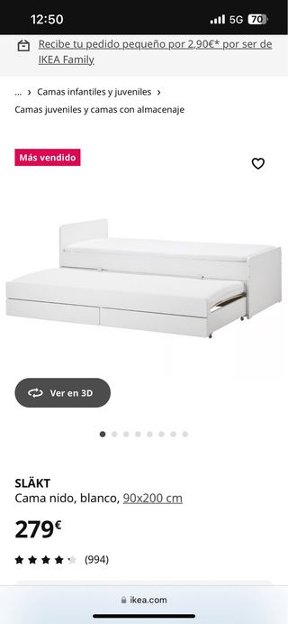 Cama nido de IKEA en color blanco. Ideal para habitaciones juveniles o infantiles. - Incluye somier. - Colchones no incluidos. Los vendo aparte No hago envios