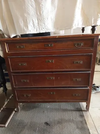 Cómoda de madera con un diseño clásico, ideal para proyectos de restauración. Sus cajones ofrecen espacio de almacenamiento. - Cuatro cajones amplios. - Tiradores metálicos originales.