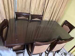 Conjunto de mesa y 6 sillas a juego. La mesa tiene unas dimensiones de 140 cm de largo por 90 cm de ancho. - Mesa de comedor. - 6 sillas de comedor.