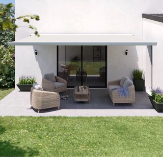 Toldo eléctrico con acabado en blanco. Ideal para exteriores. - Mecanismo retráctil. - Estructura de metal y plástico.