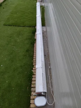 Toldo eléctrico de 5 metros de la marca Leroy Merlin con barra metálica para colgar. - Estructura de metal. - Color blanco.