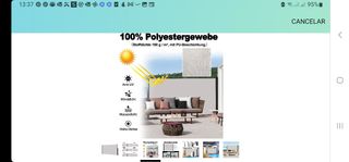 Toldo de tela tipo vela triangular. Viene con anillas y cuerda para atarla. Es impermeable y protege de los rayos UVA. Compré varias y esta no me hace falta. Mide 5 metros en cada lado. Para terraza, jardín, patio...
