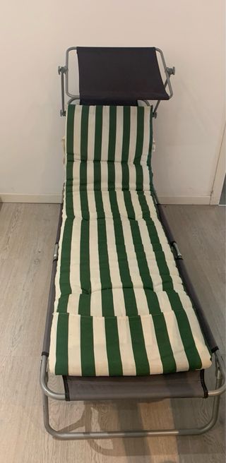 Tumbona de playa con estructura metálica y tejido resistente. Es plegable y fácil de transportar. - Diseño moderno. - Cómoda para exteriores. Esta es una tumbona de playa/jardín plegable con un toldo ajustable, probablemente de la marca TecTake. Incluido cojín de rayas verdes y blancas. Venta en persona