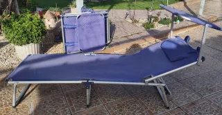 Preciosa tumbona plegable de metal y tela, ideal para disfrutar del sol. Se encuentra en perfecto estado. - Capacidad de hasta 150 kg. - Incluye parasol. - Fácil de plegar y guardar. - Medidas ver foto