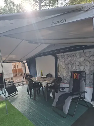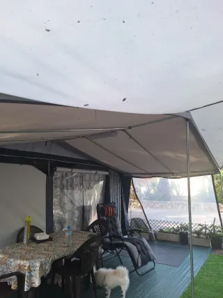 Toldo INACA en excelente estado, utilizado solo durante tres meses. - Material de poliéster. - Color gris con detalles multicolor.
