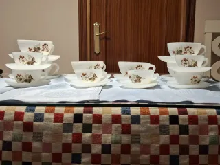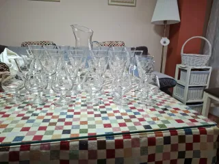 Juego de copas de cristal, tazas y jarras.