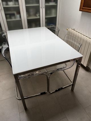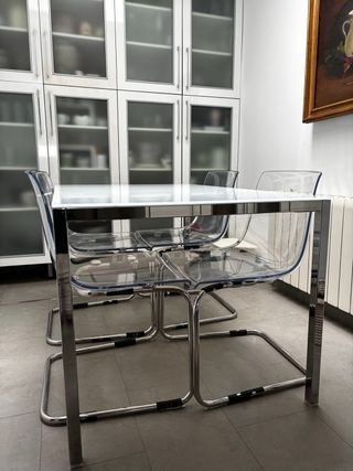 Conjunto de mesa de comedor con diseño moderno y cuatro sillas. - Mesa con sobre de cristal. - Estructura de las sillas y mesa en metal. - Asientos y respaldos de las sillas en plástico policarbonado transparente. El asiento de una de las sillas tiene un pequeño defecto en la superficie, que no afecta a su utilidad y por lo que se ha rebajado el precio.