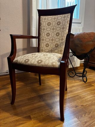 Elegante sillón con un diseño clásico y confortable. - Estructura de madera robusta. - Tapicería con un patrón geométrico en tonos beige y marrón. - Brazos curvos para mayor comodidad.