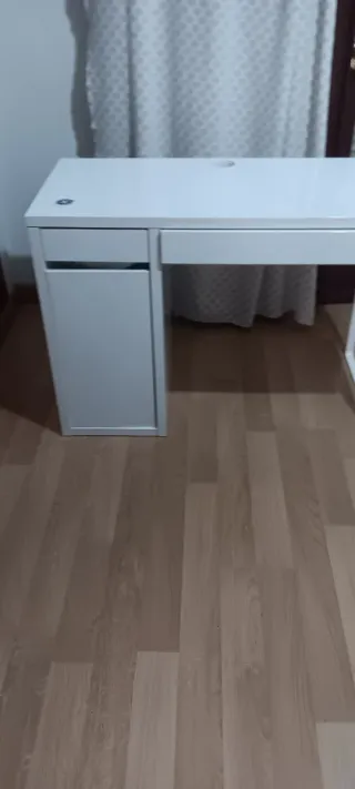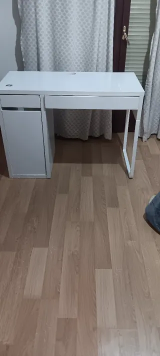 Escritorio de diseño moderno y funcional. - Amplia superficie de trabajo. - Cajón integrado par almacenamiento. - Hueco para pasar cables. .- En perfecto estado excepto la tapa de la mesa pero se puede arreglar con un vinilo. El cajón principal está desfondado ( típico de Ikea) pero tiene fácil solución.