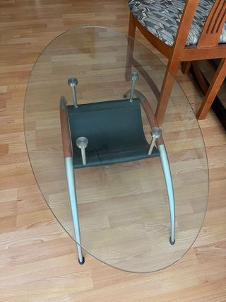 Mesa de centro de cristal ovalada con estructura metálica. Es una mesa elegante y moderna, ideal para cualquier salón. - Tiene una base de metal plateado. - La superficie de cristal es transparente y está en muy buen estado. - Perfecta para espacios reducidos.
