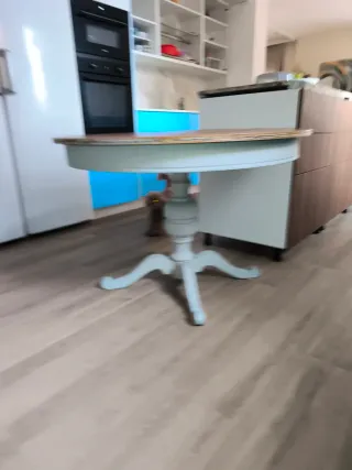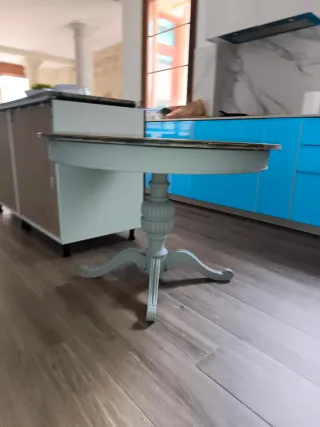 Mesa de cocina o comedor restaurada con un diseño elegante. - Tablero de madera barnizada. - Base de madera maciza con un pie central. - Acabado en tono gris piedra.